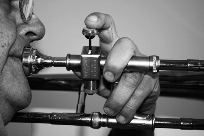 "It doesn't change the basic integrity of the slide trombone at all," he says. "It's far clearer and cleaner than any double-tonguing technique. It puts a beautiful, clean point on the beginning of notes, no matter how fast they're played. It takes time to get it together, but it's well worth it."